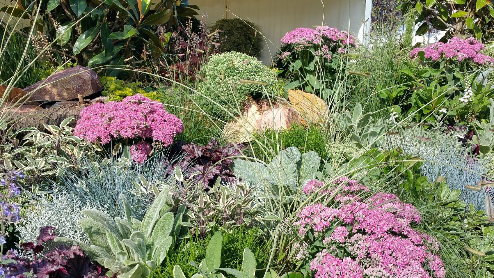 Leuchtende Spätblüher wie Astern, Chrysanthemen, Sommerheide (Callune), Alpen- und Hornveilchen prägen den Garten und die Terrasse im September und Oktober. Ein wichtiges Element sind natürlich die dekorativen Ziergräser wie das Federborstengras oder das rote Blutgras. Auch die pflegeleichten Sedumsorten haben ihren festen Platz im aktuellen Herbstprogramm. Blattschmuckstauden wie die Heuchera mit ihren farblich sehr unterschiedlichen Blättern gehören ebenfalls fest zum Sortiment.